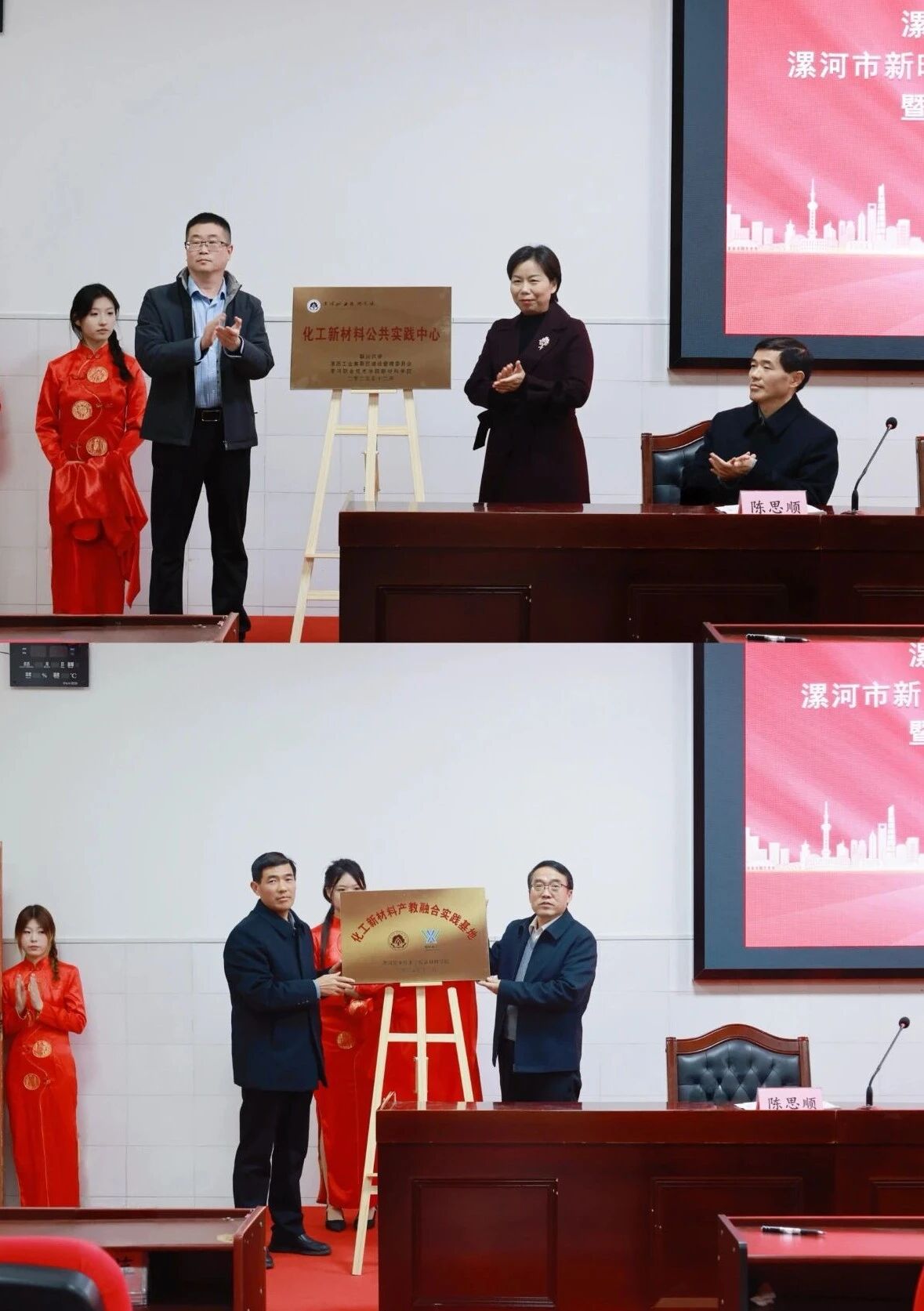 签约环节中,三方代表共同签署《产教融合框架协议》,并为“化工新材料公共实践中心”与“化工新材料产教融合实践基地”揭牌。接下来,这两大平台将成为我校新材料领域从理论迈向实践、从校园走向产业的重要纽带。