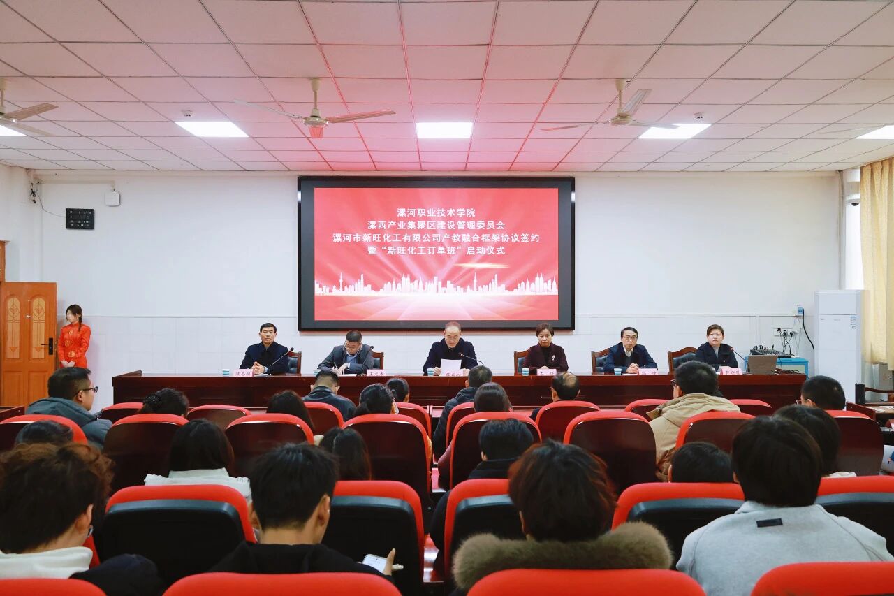 12月8日下午,漯河职业技术学院、漯西产业集聚区建设管理委员会与漯河市新旺化工有限公司,共同举行产教融合框架协议签约暨“新旺化工订单班”启动仪式。校长薛存心、副校长石晓、漯西工业集聚区管委会主任王文杰、漯河市新旺化工有限公司总经理郭峰等共同出席活动。仪式由新材料学院党总支书记芦晓星主持。