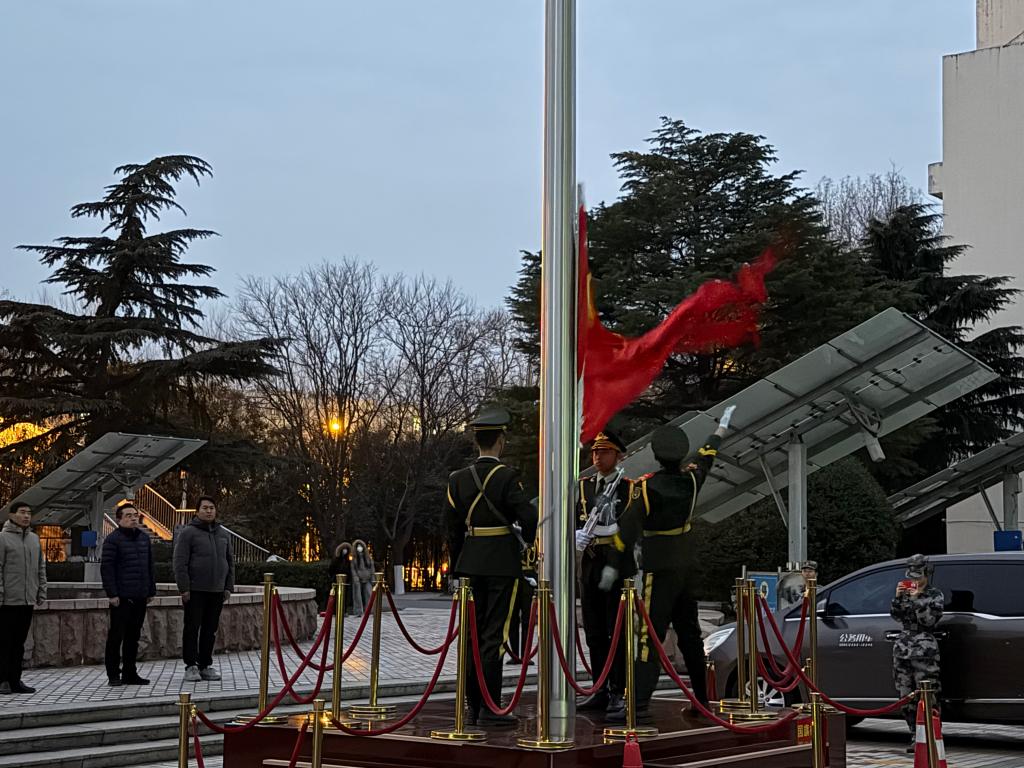 晨光熹微中,仪式正式拉开帷幕。学院国旗护卫队成员迈着铿锵有力的正步,神情坚毅地护送五星红旗走向升旗台。伴随着雄壮激昂的《义勇军进行曲》,鲜艳的五星红旗冉冉升起、迎风飘扬。全体师生肃立注目,齐声高唱国歌,目光追随着国旗攀升的轨迹,心中涌动着对祖国的无限崇敬与热爱,现场氛围庄严而神圣。