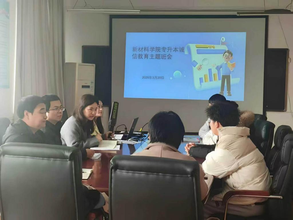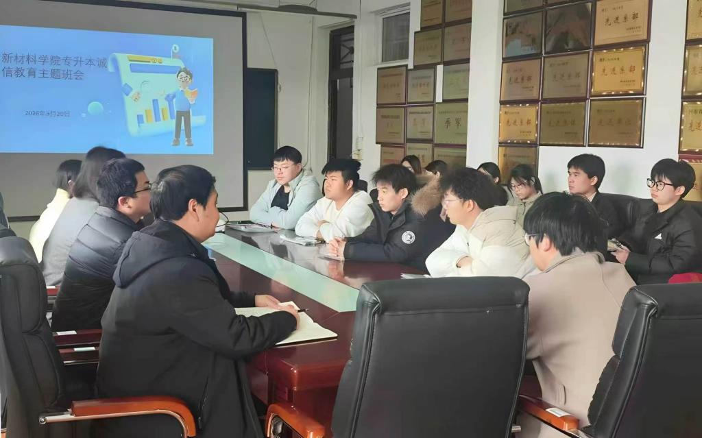 为深入贯彻落实《河南省2026年普通高校专升本考试考务工作实施细则》精神,确保专升本考试平稳有序进行,2026年3月20日上午,新材料学院召开2026年专升本文化课考试“无声入场及诚信教育培训”主题班会。本次班会由辅导员郭晓秋主持,党总支副书记刘心宽、送考教师田灿灿出席,2023级应用化工技术专业22名考生参加培训。学生工作部学生管理科科长宋蕾到会督导指导。
